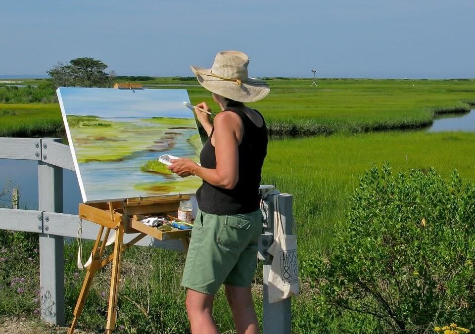 photo of artist Mimi Schlichter painting at an easel overlooking the beach